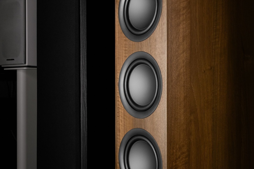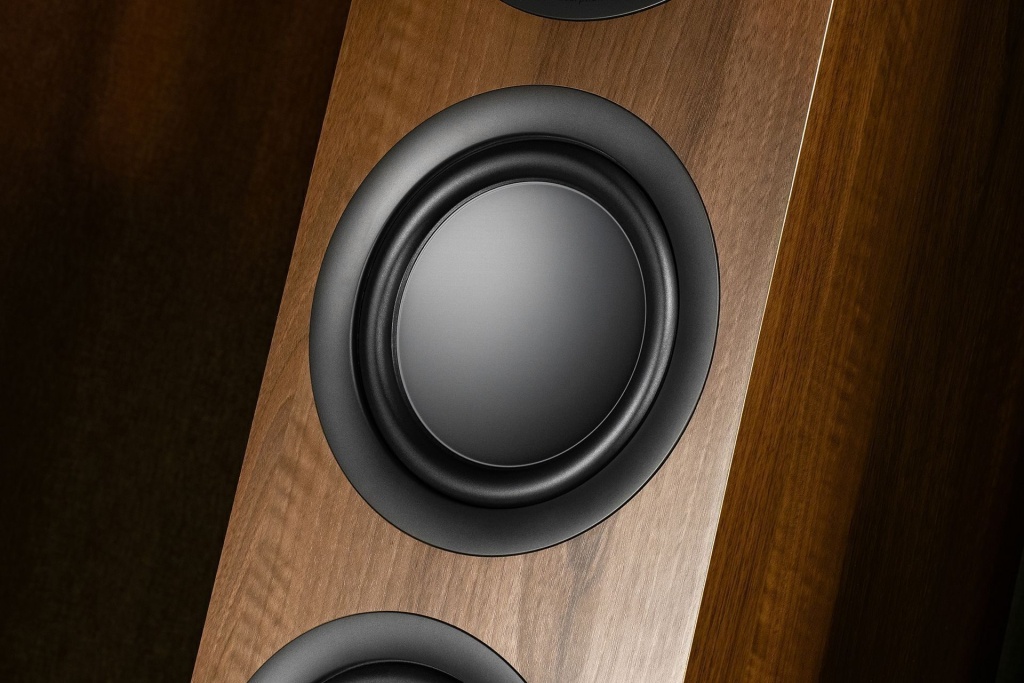 Басовиков сразу три, диаметром по 6,5 дюйма. Их называют гибридными из-за двухслойной конструкции диффузора: нижний опорный слой сформирован бумагой, а внешний — алюминием. Причем это не сендвич в привычном понимании, а трансформация привычных технологий в кое-что новое: бумага здесь выступает опорной точкой для алюминия, и не формирует дубликат диффузора во внутреннем слое. По расчетам инженеров, такая конструкция дает басу больше контроля и точности, избавляя от искажений при активном поршенвом движении.