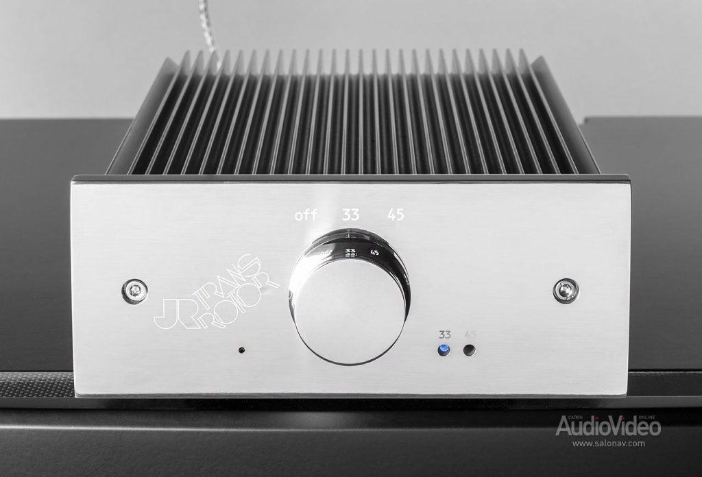 Двигатель питается от выносного блока Konstant FMD, который вырабатывает переменное напряжение с двумя стабильными частотами для 33 1/3 и 45 об/мин. Предусмотрена плавная регулировка обеих скоростей в пределах ±5%. На задней стенке блока имеется заглушка — в этот разъём включается опционная рукоятка Switch для дистанционного включения проигрывателя. Кстати, 10- килограммовый алюминиевый диск стартует плавно, и не только из-за инерции — так сделано специально, чтобы устранить резкие нагрузки на пассик.
