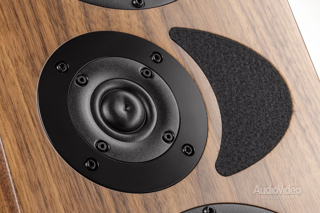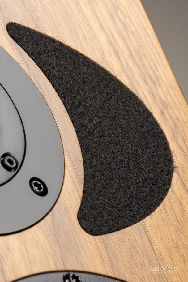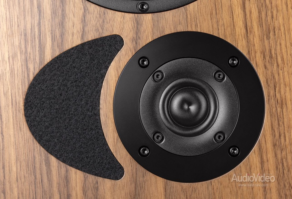 На лицевой стороне Forté головки располагаются по схеме д’Апполито, но не по классике, соосно, а со смещением. Вырез в форме полумесяца со вставкой из звукопоглощающего материала, который виден рядом с пищалкой, вероятно, ослабляет часть отраженной корпусом энергии ВЧ и наверняка влияет каким-то особым образом и на диаграмму направленности.
