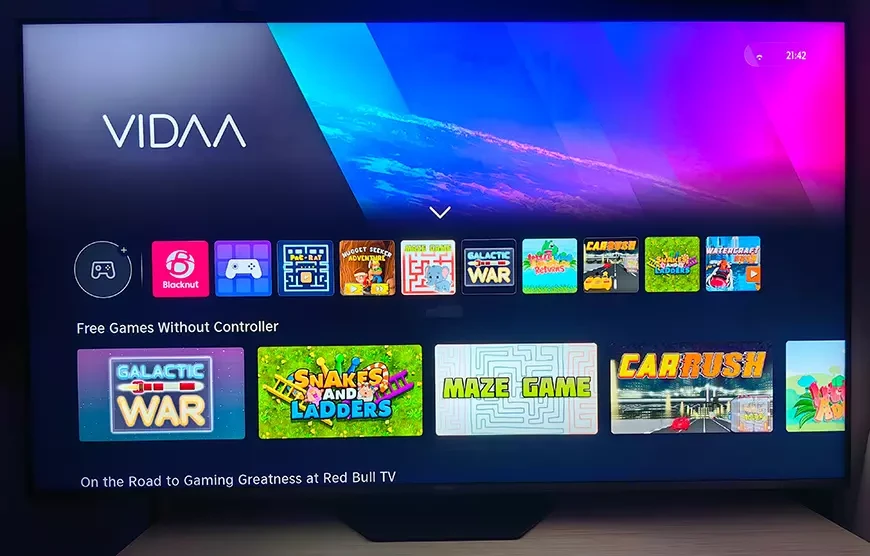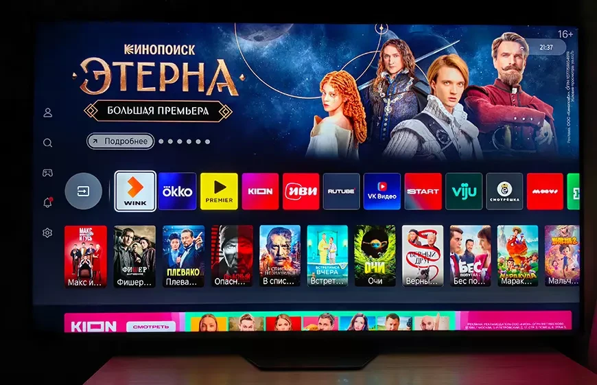 Как и все телевизоры компании, Hisense 65U8Q работает под управлением фирменной ОС VIDAA, здесь установлена ее версия 9.0. Она предоставляет все необходимые смарт-функции, включая доступ ко всем актуальным для нашего рынка стриминговым сервисам, в том числе VK Видео, KION, Wink, Кинопоиск, ОККО, PREMIER, Иви, START и т. д. Управлять телевизором можно при помощи комплектного пульта ДУ с поддержкой зарядки от солнечных батарей, а также через фирменное мобильное приложение VIDAA.