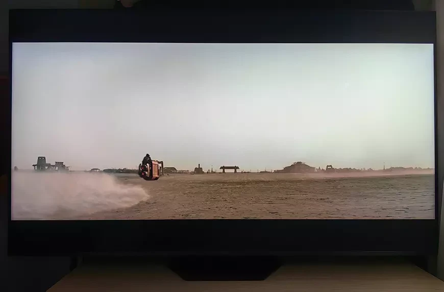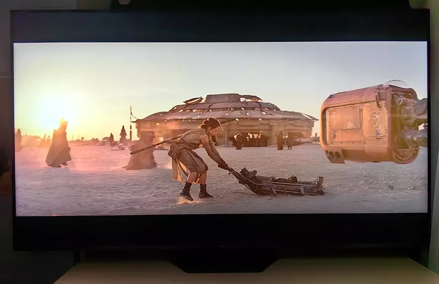 При просмотре реального контента мы сразу отметили глубочайший черный цвет, практически способный соперничать с OLED-панелями. Гало вокруг ярких объектов на черном фоне было минимальным среди всех, что мы видели в исполнении телевизоров Mini-LED. При этом яркость на HDR была потрясающей – при всех сомнительных художественных достоинствах фильм «Звездные войны: Пробуждение силы» может служить отличным образцом для оценки качества изображения – рассвет на песчаной планете такой силы, что невольно хочется зажмуриться и закрыть лицо рукой.