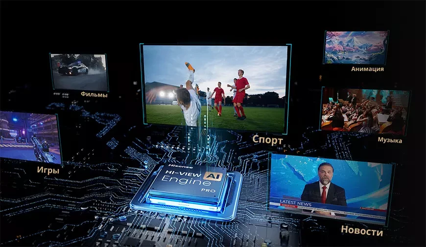 За обработку изображения отвечает фирменный процессор Hi-View Al Engine PRO, в котором встроено множество технологий, каждая из которых отвечает за свой участок работы. Если входящий видеосигнал имеет разрешение ниже 4K, его обработкой занимается нейросеть AI 4K Upscaler, обученная на эксклюзивном наборе пресетов. Она анализирует каждый кадр и масштабирует изображение до качества, максимально приближенного к 4K UHD. Следующая – AI HDR Upscaler – за счет локального управления контрастностью может не только улучшить контент HDR10 до близкого к HDR10+, но и расширить динамический диапазон обычного SDR-сигнала. С помощью встроенного датчика AI Chroma Light Sensor адаптирует изображение к условиям освещения, а определение цветовой гаммы в помещении позволяет управлять как яркостью, так и цветом изображения.