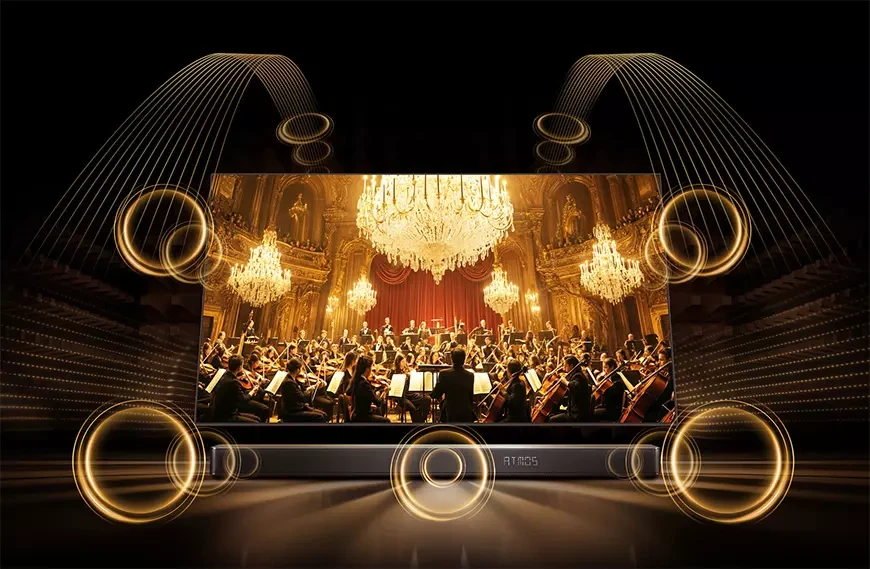 Встроенная акустическая система имеет формат 4.1.2 и включает семь динамических излучателей, два из которых расположены по бокам корпуса, по два в верхней и нижней части, а по центру находится низкочастотный динамик. Их общая мощность составляет 90 Ватт, что весьма прилично для 65-дюймового телевизора. Еще одно преимущество звуковой системы – поддержка технологии Hi-Concerto, позволяющей объединить «голос» телевизора со звучанием фирменного саундбара, такого, например, как Hisense HT Saturn.