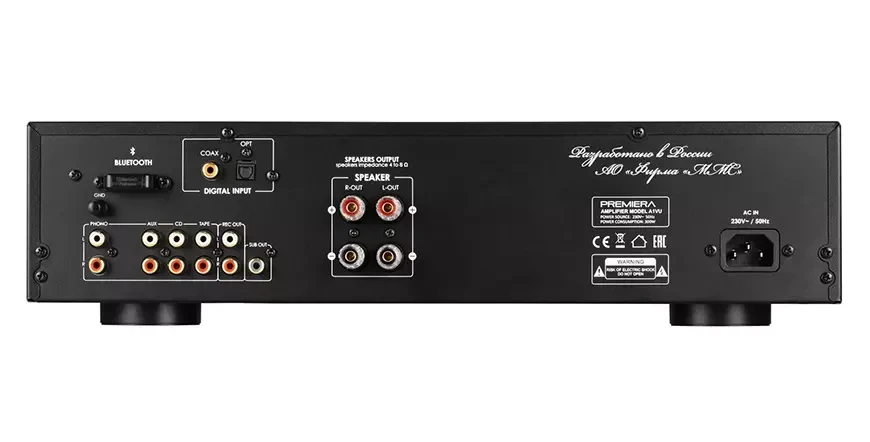 Как и полагается современному интегральному усилителю, в Premiera A1VU есть полноценная цифровая часть. Блок ЦАП построен на 32-битном чипе AK4432 от компании Asahi Kasei, он может работать с цифровыми потоками РСМ с параметрами вплоть до 32 бит / 192 кГц. Усилитель способен принимать на коаксиальный вход сигнал с разрешением до 32 бит / 192 кГц, а на оптический – до 24 бит / 96 кГц. В наличии также есть порт USB-A для подключения внешних накопителей, встроенный плеер может воспроизводить файлы в форматах MP3, MP4, WAV, AIFF и FLAC с разрешением вплоть до 24 бит / 96 кГц. Тем, кто любит транслировать музыку с портативных гаджетов, адресован адаптер Bluetooth версии 5.0, правда, о поддержке кодеков с низкой степенью сжатия производитель не упоминает.