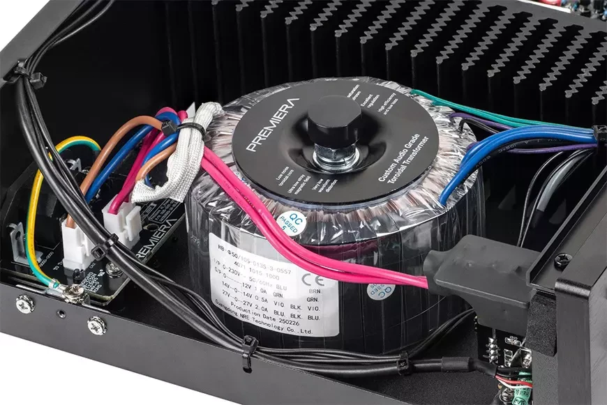 Казалось бы, перед нами ровно тот же самый усилитель, что и год назад, однако взгляд под крышку все же позволяет найти определенные различия в конструкции и элементной базе. Это классический полный усилитель, в котором мощный блок питания построен на базе крупного тороидального трансформатора. В выходных каскадах, работающих в классе А/В, использованы комплементарные пары транзисторов 2SD1047/2SB817 компании Inchange Semiconductor, установленные на литом радиаторе охлаждения. Заявленная выходная мощность составляет 51 Ватт на канал при работе на нагрузку номинальным сопротивлением 8 Ом. С учетом того, что аппарат потребляет из сети до 300 Ватт, запас по мощности у модели внушительный.