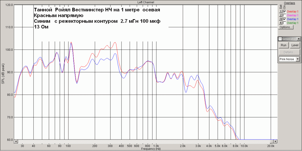 Динамики здесь разного импеданса, 12 Ом у басовика и 8 Ом у рупорной пищалки. Они примерно равны по чувствительности, с небольшим запасом отдачи у твитера. На сравнительной АЧХ это видно.