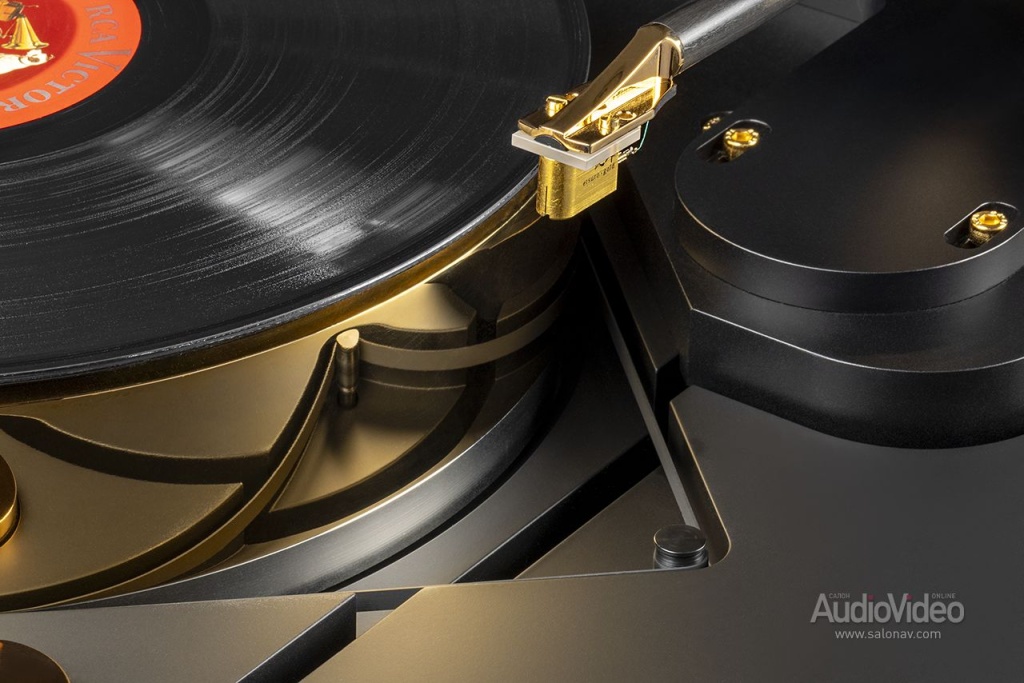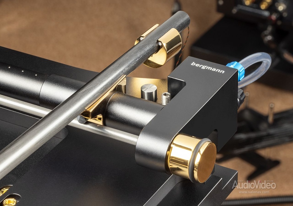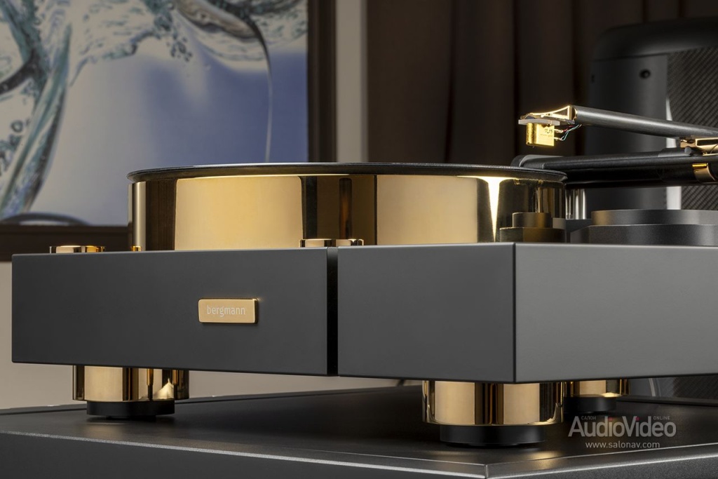 Для топовой модели Bergmann Galder Signature Gold Edition подушка особенно актуальна — диск из немагнитной нержавеющей стали весит 36 кг, и без подкачки воздуха скорый износ опорного узла был бы неминуем. Что стоит отметить особо, компрессор у этой модели совершенно бесшумный, поэтому его можно разместить в непосредственной близости от остальной аппаратуры. Масса диска необходима для инерции, которая сглаживает мгновенные колебания скорости, а также уводит основной резонанс конструкции в неслышимую инфранизкую область.