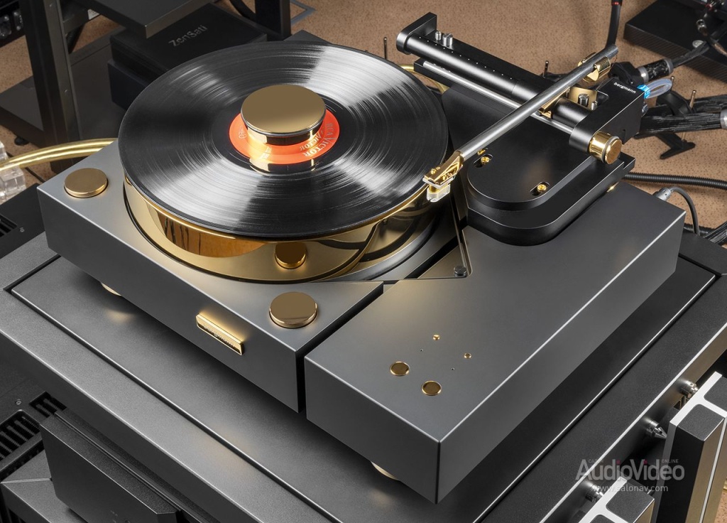 Редкая удача: топовая модель датского гуру, да ещё в эксклюзивном золотом исполнении. Единство формы и содержания: двойное шасси, опорный диск увеличенной массы с вакуумным прижимом пластинки, тангенциальный тонарм с воздушным подшипником и, как завершение композиции — эксклюзивный японский картридж Etsuro Gold ручной работы.