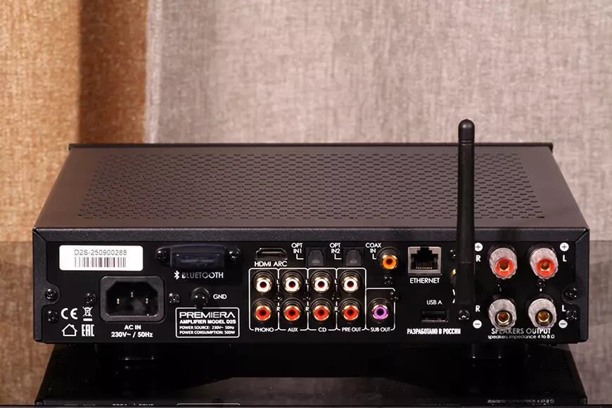 Тип – интегральный стереофонический усилитель | Название – Premiera D2S | Цена, рублей – 59 990 | АЧХ – 5 – 35 000 Гц | Коэффициент демпфирования – более 260 (на частоте 50 Гц) | Выходная мощность – 2 х 167 Вт на 4 Ома | КНИ – 0,025% | Соотношение «сигнал – шум» – более 90 дБ | Входы – аналоговые линейные RCA (2), аналоговый Phono (1), цифровой коаксиальный (1), цифровой оптический (2), HDMI ARC (1), USB-A (1), Ethernet (1) | Выходы – предварительный усилитель (стерео, RCA), сабвуфер (моно), гнездо 3,5 мм для наушников | Габариты, мм – 355 x 155 x 345 | Масса, кг – 3,2 кг