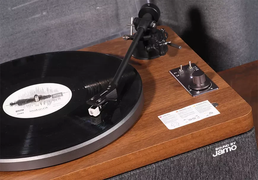 Нижняя часть корпуса отдана под электронику и двухполосную стереофоническую акустическую систему, за создание которой отвечали специалисты знаменитого датского бренда JAMO. Её динамики нагружены на вынесенные на боковые панели овальные порты фазоинвертора. Постоянная мощность заявлена на уровне 12 Ватт на канал, общая пиковая максимальная мощность системы достигает 30 Ватт. Подумали создатели и о защите расположенного сверху проигрывателя от вибраций – для этого предусмотрены пружинные демпферы.