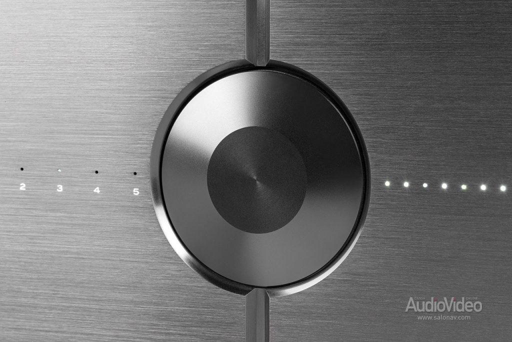 У Maestro 2.0 пять линейных входов: три на RCA и пара на XLR. Ни фонокорректора, ни встроенного ЦАПа у него нет — владелец усилителя такого класса явно предпочтёт отдельные компоненты системы. Нужный вход выбирается с пульта ДУ и подтверждается свечением голубого светодиода из линейки слева от крупной ручки регулятора громкости, которая также является и контроллером при задании дополнительных режимов усилителя. В аттенюатор с шагом 1 дБ заложены четыре характеристики регулирования (три логарифмических и линейная), оптимальная выбирается в зависимости от чувствительности акустических систем. Установленный уровень громкости показывается линейкой светящихся точек справа. Баланс каналов регулируется через нажатие контроллера.