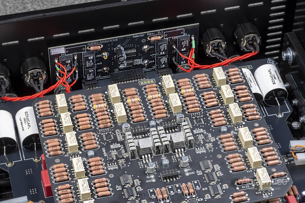 И, наконец, элементная база. На фото вверху — балансный регулятор громкости, построенный на магазине сопротивлений, которые коммутируются миниатюрными реле. Так вот, это прецизионные резисторы Dale RN60D с допуском 0,25% ценой около 50 евроцентов каждый. Также видны входные плёночные конденсаторы Sonicap 1 мкФ х 600 В с малыми утечками. Трёхэтажная компоновка позволила сократить путь сигнала.