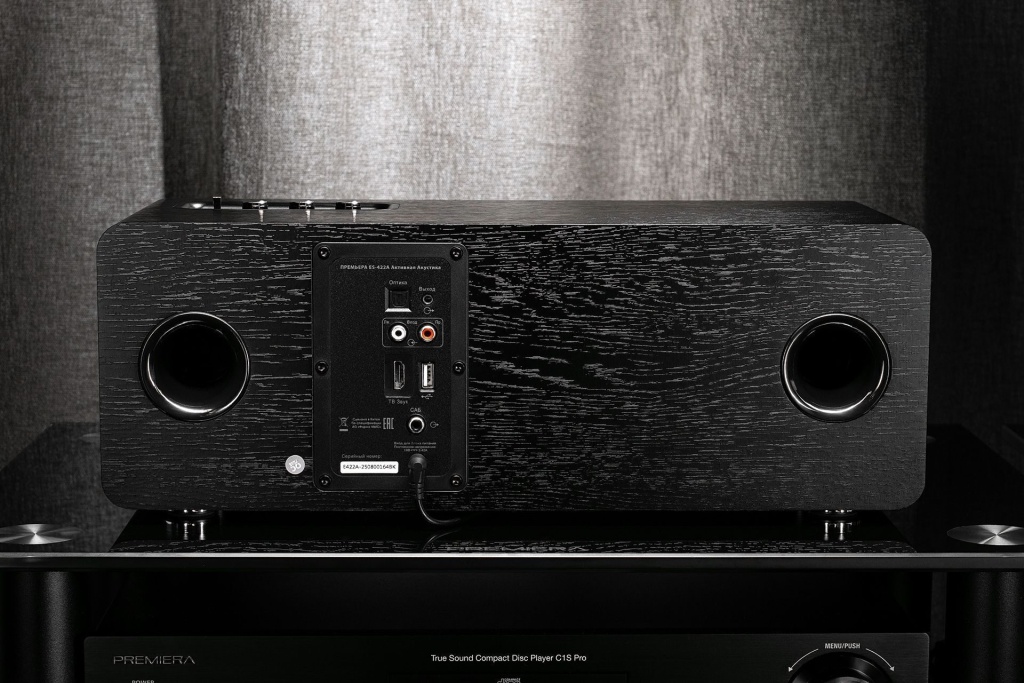 По сторонам задней панели разнесены фазоинверторы, между ними находится блок коммутации. Способов получить сигнал от внешних источников достаточно: для аналогового сигнала есть пара RCA, для цифровой коммутации предусмотрены оптический вход, HDMI ARC и USB Type-A — в него можно подключить флешку с музыкой. Предусмотрен выход на сабвуфер и даже выход на наушники 3,5 мм, который открывает возможность для чисто лайфстайловых сценариев: подключаем смартфон по Bluetooth к ES-422A, а к ней — аналоговые проводные наушники. Шах и мат, индустрия TWS.