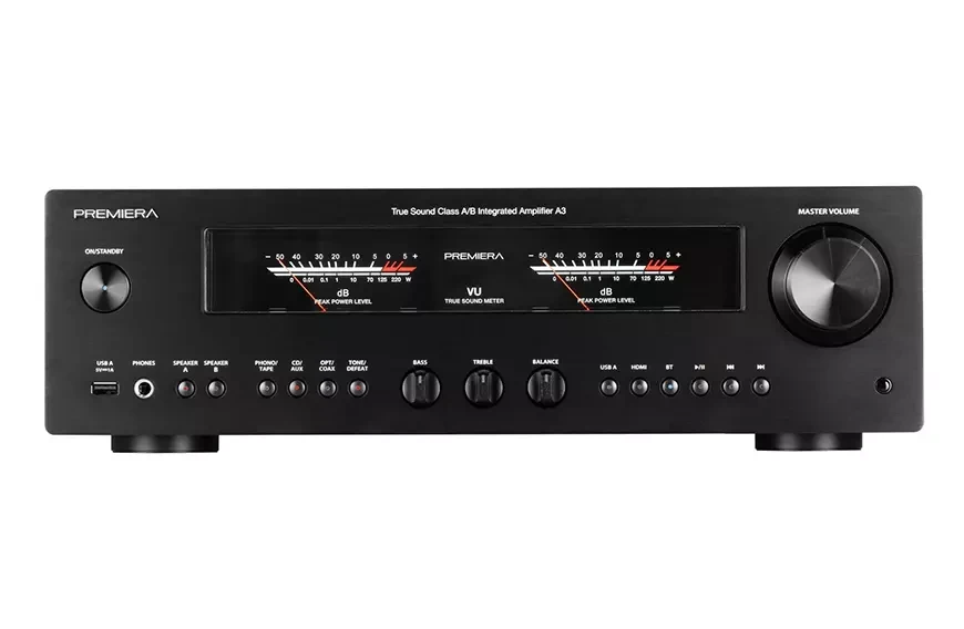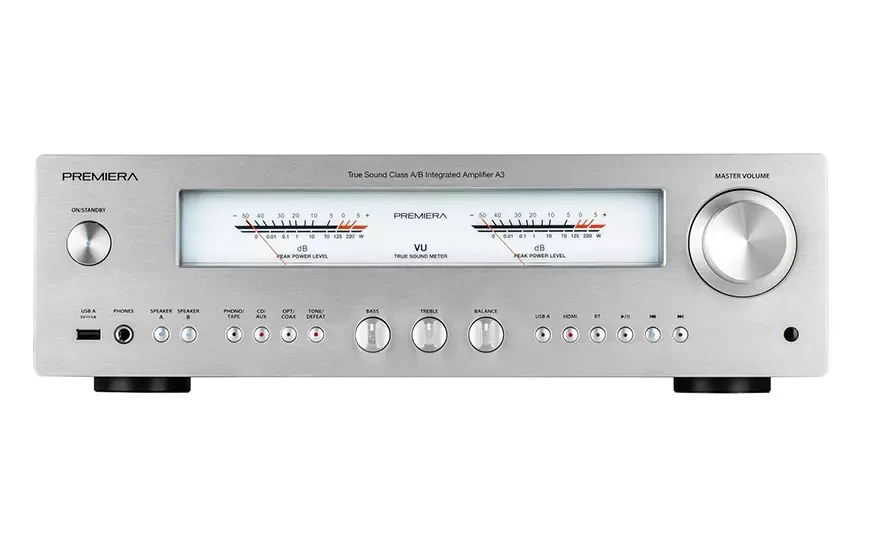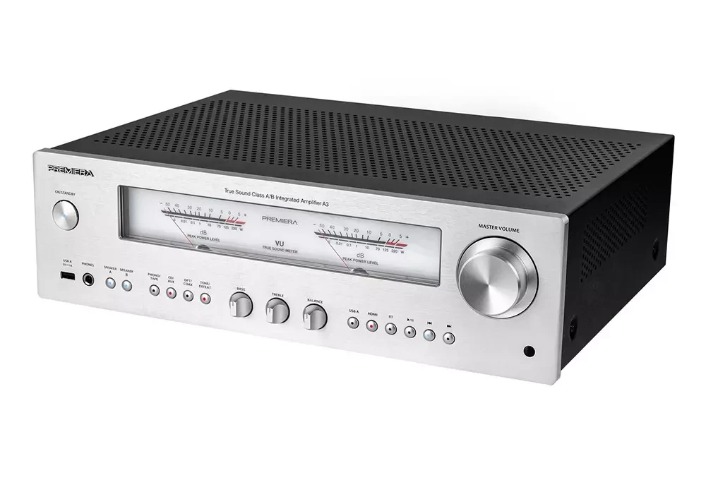 Premiera A3 – современный интегральный стереоусилитель, работающий в классе A/B со встроенными MM/MC фонокорректором, ЦАП, Bluetooth, входом HDMI ARC, развивающий выходную мощность 110 Вт на канал. При общей сдержанности дизайна, свойственной всем устройствам Premiera, усилитель A3 выделяется крупными и яркими стрелочными VU-индикаторами и ручками темброблока под ними. Эти два элемента придают модели винтажный вид, столь модный сегодня. При этом управление усилителем без информационного дисплея и меню не стало менее удобным – кнопки и поворотные регуляторы прекрасно справляются, даже сложные процедуры вроде обновления ПО или возврата к заводским установкам можно провести, используя комбинации кнопок на лицевой панели.  К тому же всегда поможет пульт дистанционного управления, который идёт в комплекте.