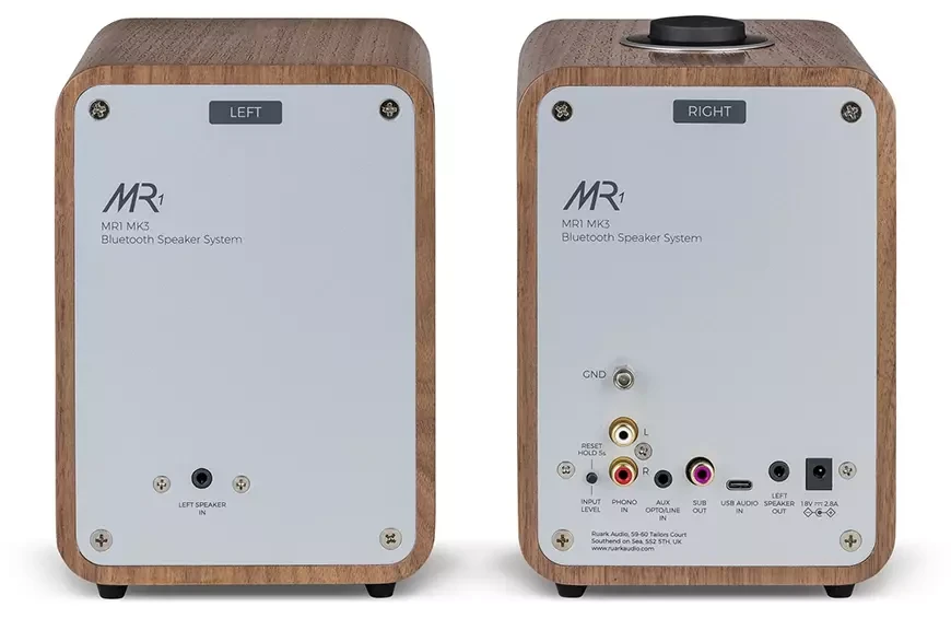 Беспроводные АС Ruark MR1 Mk3 поддерживают Bluetooth-соединение с кодеками aptX HD, aptX, AAC, SBC, BLE и A2DP. Среди других разъёмов: вход USB-C, комбинированный оптический и аналоговый вход на разъёме миниджек 3,5 мм, а также вход Phono для подключения проигрывателей виниловых пластинок с MM-картриджем. Для тех, кому может не хватать глубины баса, предусмотрен выход на активный сабвуфер, например, Ruark Audio RS1, который идеально сочетается по дизайну с колонками MR1 Mk3.