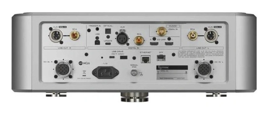 ЦАП в устройстве — фирменный Master Sound Discrete DAC G2 на базе FPGA с многоуровневой архитектурой. Он поддерживает декодирование DSD до 22,5 МГц и PCM до 768 кГц. Для конвертации цифрового сигнала в ток используются резисторы MELF и усилительные элементы IDM-01. Аналоговый выход построен по фирменной схеме Esoteric-HCLD (High Current Line Driver) с высокой скоростью нарастания напряжения до 2000 В/мкс.