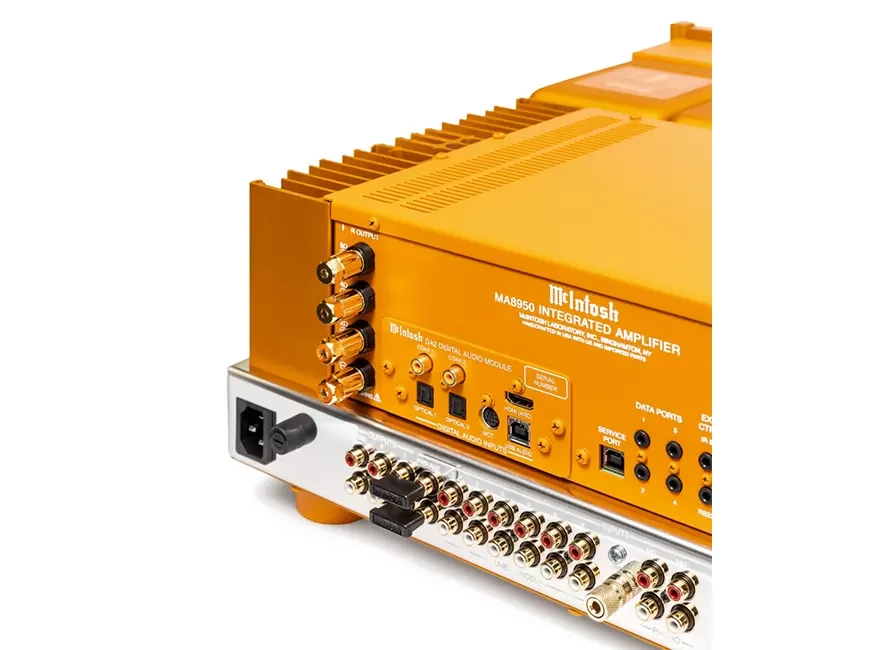 Да, перед вами интегральный усилитель McIntosh MA8950, на который будто вылили банку оранжевой краски. Это совсем не то, к чему мы привыкли, когда речь идёт о продукции McIntosh — не чёрная стеклянная фронтальная панель и не чёрная верхняя крышка обычного усилителя MA8950. Оранжевый усилитель — уникальный экземпляр и, насколько нам известно, не продаётся.
