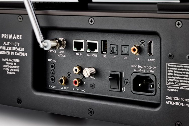 Внутри корпуса Primare Allt-i-Ett – шесть басовых динамиков, два среднечастотных драйвера, два твитера с волноводами, стриминговый модуль, усилитель мощностью 300 Вт, фонокорректор/предусилитель, тюнеры FM и DAB+ и продвинутый ЦАП. Есть функция автокоррекции; 11-полосный графический эквалайзер; технология BACCH 3D обеспечивает высокое качество воспроизведения объёмного звука. Предусмотрено несколько режимов, автоматически настраивающих звучание в зависимости от того, где установлена система: далеко от стен, возле стены или в углу. Управлять устройством можно с помощью пульта, смартфона или встроенной сенсорной панели. Коммутация: HDMI eARC, коаксиальные и оптические разъёмы, USB-A, пара аналоговых RCA, поддержка WLAN или LAN, AirPlay 2, Spotify Connect, TIDAL Connect, Qobuz Connect, Bluetooth (с кодеками SBC, AAC, aptX, aptX-HD). Разумеется, «на борту» и фирменная технология Prisma с поддержкой UPnP/DLNA и интернет-радио. Подключить наушники можно как традиционным, так и беспроводным способом. Есть выход на сабвуфер, что делает Allt-i-Ett альтернативой саундбарам при использовании системы в составе комплекта домашнего кинотеатра или для оснащения медиакомнаты.