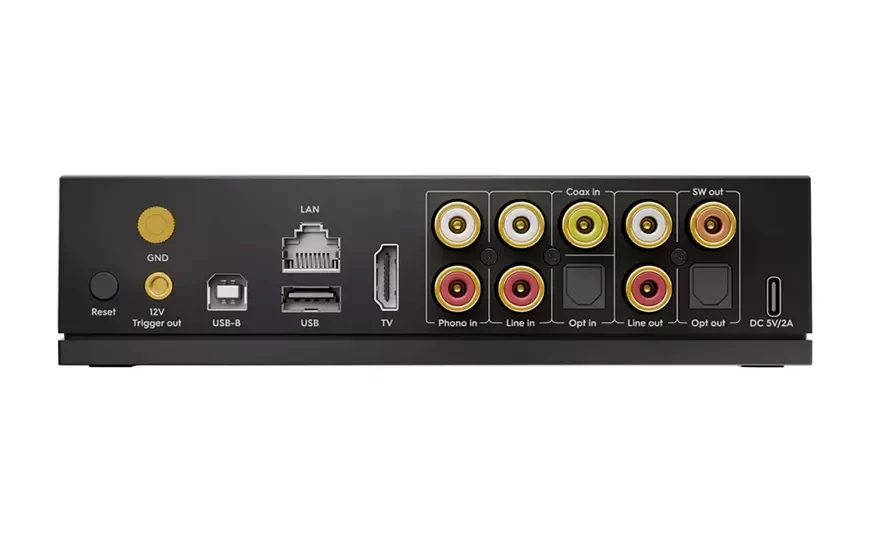 Физический коммутационный арсенал стримера Arylic LP100 включает оптический и коаксиальный цифровые входы, аналоговые выходы RCA для подключения внешнего усилителя или активных колонок, порт HDMI eARC, обеспечивающий передачу аудио с телевизора, а также редкий для этого ценового сегмента вход MM/MC-фонокорректора для подключения проигрывателя виниловых пластинок.