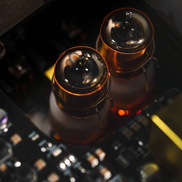 Выходные каскады усилителя для наушников — могут работать в одном из двух режимов (оба — в конфигурации «двойное моно»): полупроводниковом на JFET-приборах или на лампах NOS GE5670, отобранных вручную и работающих с минимальной отрицательной обратной связью, что позволило поднять уровень «благозвучной» 2-й гармоники на 6 дБ.