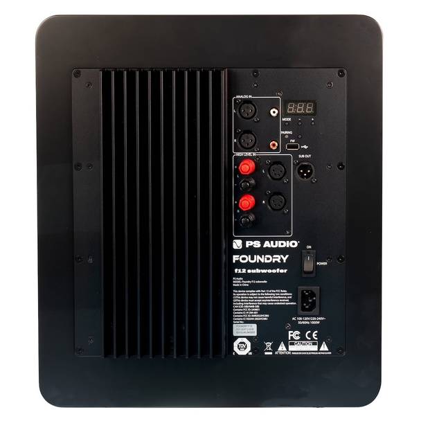 Сопряжение с акустикой помещения осуществляется встроенным DSP, управляемым посредством мобильного приложения Foundry Control. Входы — низкоуровневые RCA, балансные XLR и высокоуровневые на винтовых терминалах. В качестве опции предлагается трансмиттер WiSA, а также комплект креплений, позволяющий составить басовую колонну из двух или трех сабов F12.