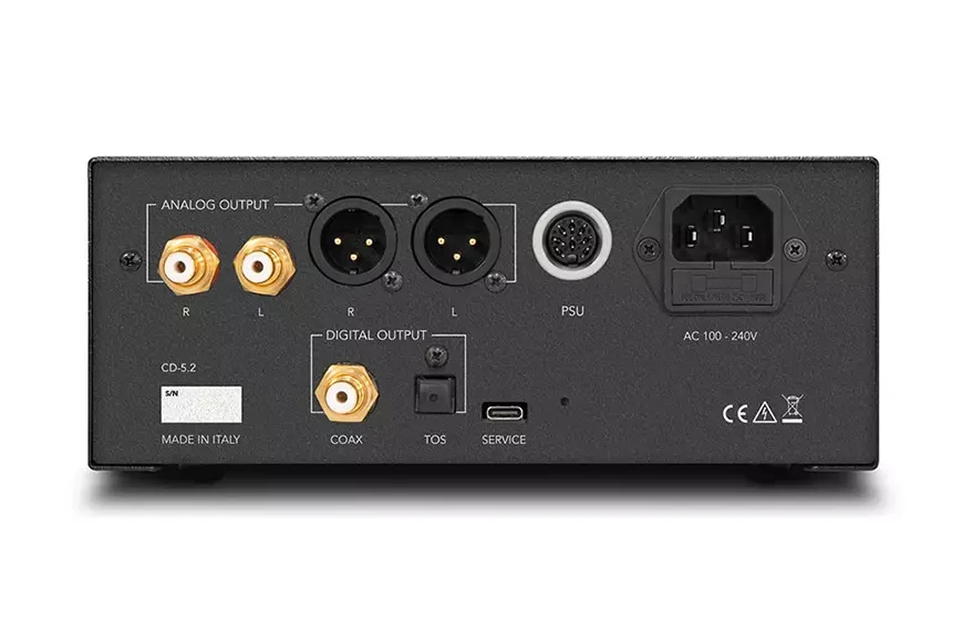 CD-проигрыватель Gold Note CD-5.2 оснащён как несимметричным аналоговым выходом на разъёмах RCA, так и балансным на XLR, оба с выходным уровнем 2 Vrms. Также предусмотрены цифровые выходы: S/PDIF коаксиальный (75 Ом) и оптический Toslink.