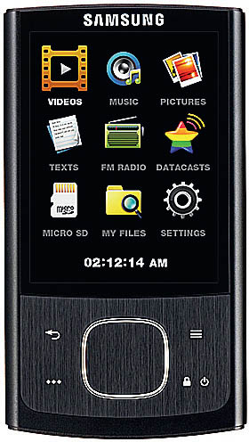 Портативный плеер SAMSUNG YP-R0 воспроизводит аудио- и видеофайлы практически всех современных форматов, способен выполнять функцию цифрового фотоальбома и электронной книги, имеет FM-радио. Он оснащен сенсорным 2,6-дюймовым экраном с матрицей размером 240×320 пикселов. Его аккумулятор позволяет в течение пяти часов смотреть видео или тридцать часов слушать музыку. Объем памяти плеера (4/8 ГБ) можно увеличить картами microSD или microSDHC. В комплекте поставки идут новые наушники-вкладыши с полосой частот от 16 Гц до 22 кГц и усиленной звукоизоляцией. Плеер управляется четырехпозиционной кнопкой. Samsung YP-R0 совместим с большим числом форматов и кодеков, которые проигрываются без предварительной конвертации. Кроме того, Samsung YP-R0 воспроизводит подкасты. Файлы любого типа можно использовать сразу после простого «перетаскивания» их в папку плеера. За качество звука отвечает фирменный процессор Samsung DNSe 3.0. YP-R0 выпускается в трех цветах: черном, серебристом и розовом; его рекомендованные цены: 3990 руб. (4 ГБ) и 4990 руб. (8 ГБ).
